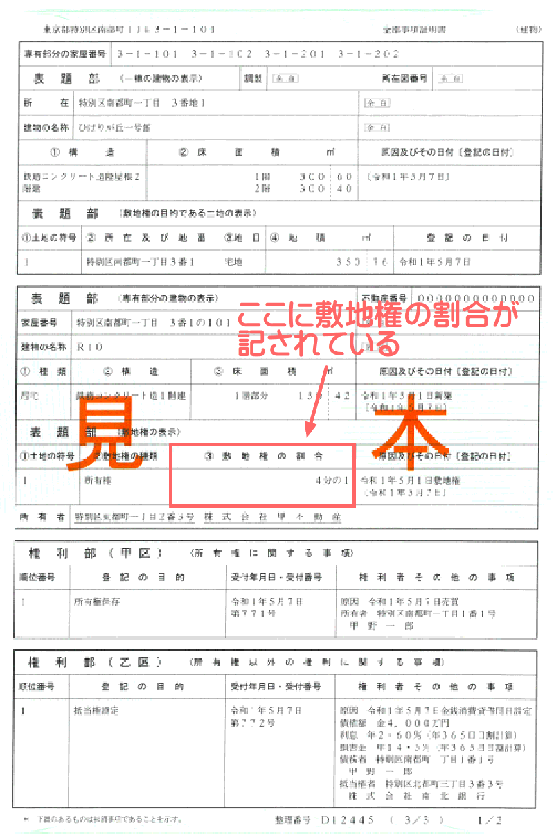 以下は、法務省が公開するマンションなど集合住宅の登記事項証明書の見本です。