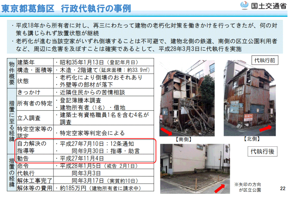 同資料の22ページには、東京都葛飾区に所在した空き家が平成27年7月10日に助言を受け、それを無視しつつ平成27年11月4日に勧告を受けたことが掲載され、その間は117日です。