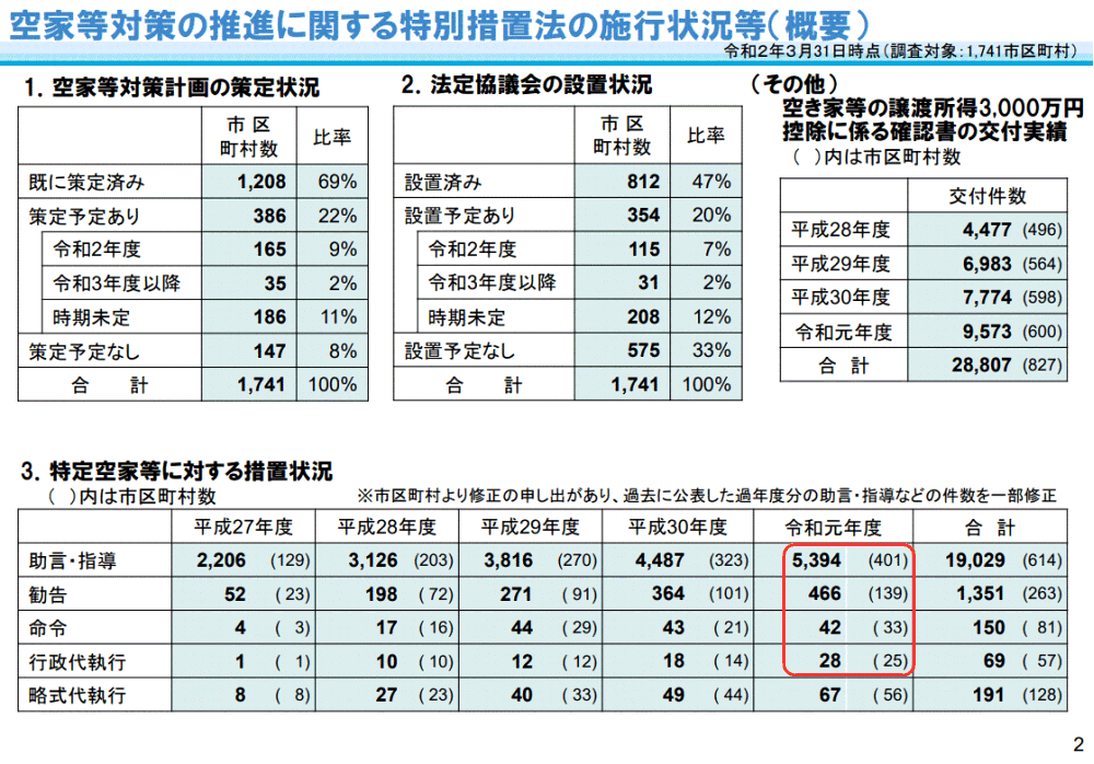 国土交通省が公開する資料「空家等対策の推進に関する特別措置法の施行状況等について」の2ページによれば、令和元年度における助言や指導を受けた特定空家等は5,394件であり、そのうち勧告を受けたのは466件、命令を受けたのは42件、行政代執行に至った特定空家等は28件とのことです。