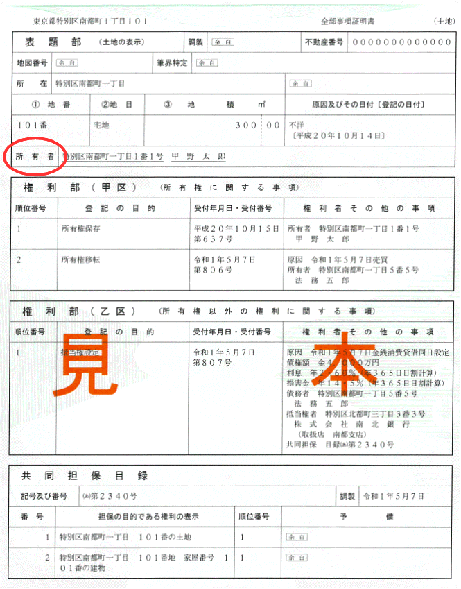 法務省が公開する建物の登記簿を写した書面である「登記事項証明書」の見本は以下のとおりであり、赤い丸で囲まれた箇所がその建物の所有者に関する情報です。