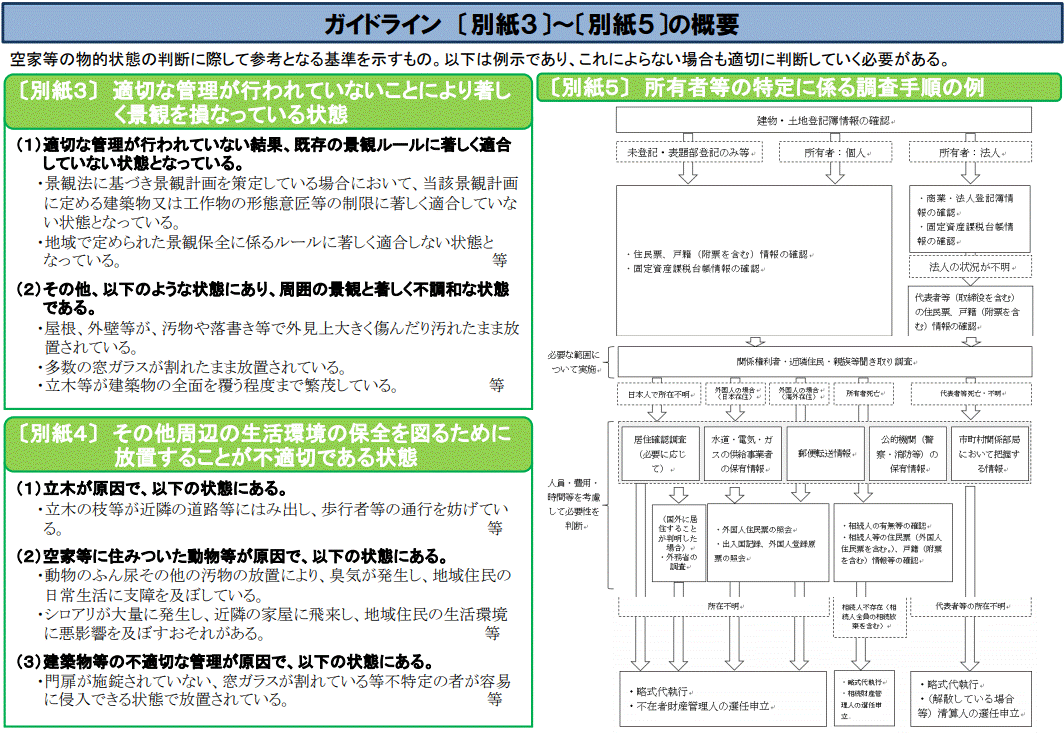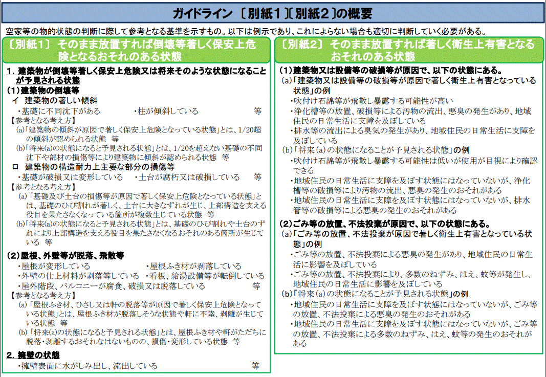 特定空家等と見なされる空き家の例は、国土交通省が公開する資料「特定空家等に対する措置に関する適切な実施を図るために必要な指針」の2ページと3ページにてご確認いただけます。