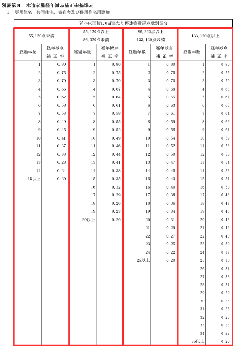表の赤い線で囲まれた列に、新築時の固定資産税評価額に掛け算すべき経年減点補正率が記されています。