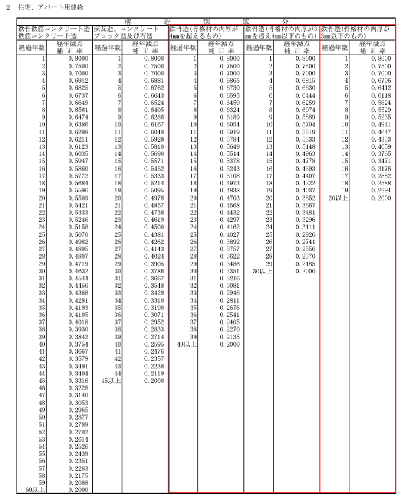 鉄骨造であれば、骨格材の肉厚が3mm以下であれば新築時の61.7625%程度まで、3mm超え4mm以下であれば71.3%程度まで、4mm超えであれば75.675%程度まで下がります。