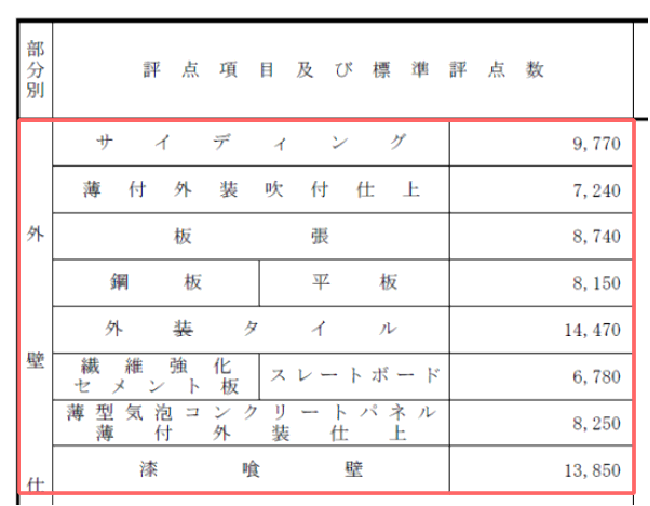 以下が、別表第8に記されている外壁の標準評点数です。