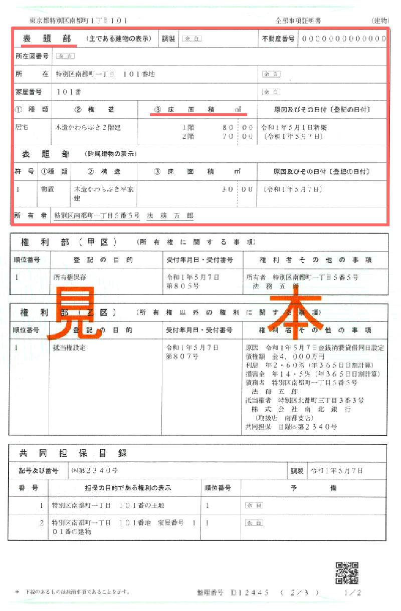 以下は、法務省が公開する登記簿を写した「登記事項証明書」という書面の見本であり、表題部の内容を確認することができます。